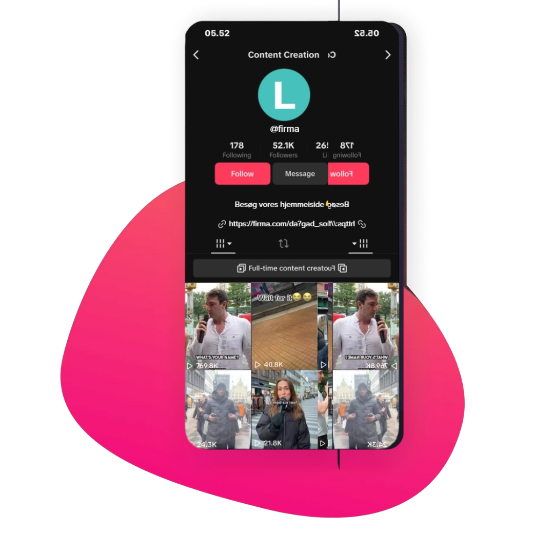 Kort sagt hjælper vi jer med at komme i gang på TikTok – eller optimerer jeres eksisterende profil. Vi skaber underholdende og relevante videoer, der sætter fokus på jeres forretning og samtidig øger både brandværdi og synlighed.